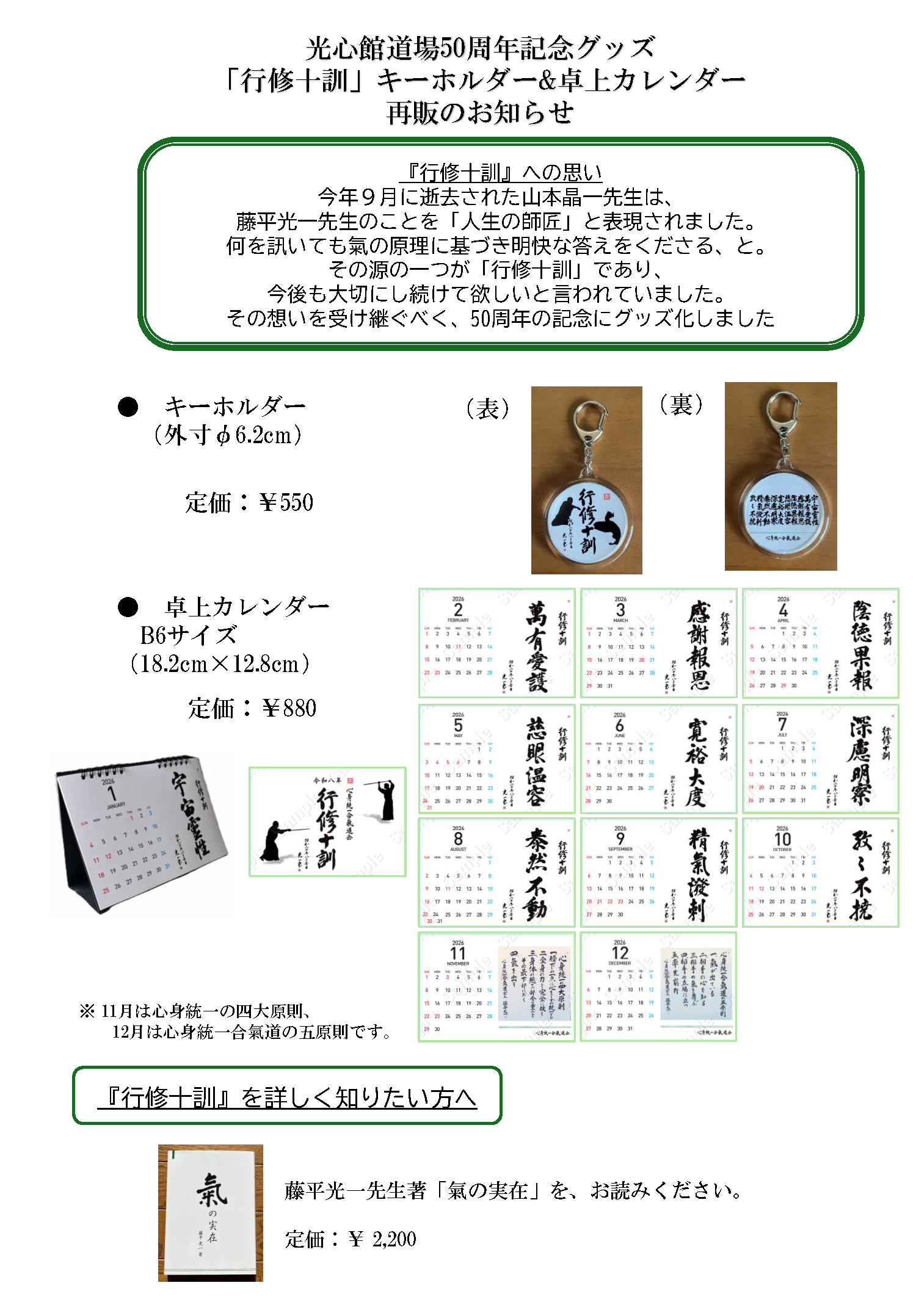 2025年12月21日(日)【再販のお知らせ】光心館道場50周年記念グッズ「行修十訓」キーホルダー&卓上カレンダー 卓上カレンダーにつきましては、再販可能ロットに達しない場合、販売しない場合がございますので、ご了承ください。 お申込みは、下記QRコードまたは、http://mail-to.link/m9/31o69u4から、メールでお申込みください。 上記が難しい場合は、メールで下記の必要事項をお送りください。 宛先:光心館道場 koshinkan@shinshintoitsuaikido.org 件名:50周年記念グッズ注文 <入力内容> ①氏名(所属道場・教室): ②カレンダー: 部 ③キーホルダー: 個 ④お受取り・お支払い: イ.光心館窓口 ・ ロ.郵送希望(送料別途必要) ⑤送付先ご住所(郵送希望の場合): ※商品代・送料・振込先は、折り返しのメールでご案内します。